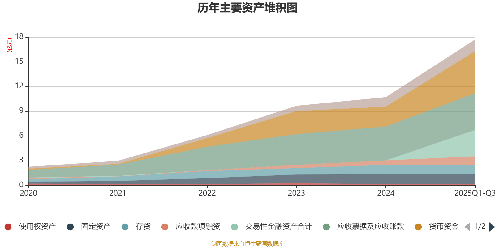 资产重大变化方面,截至2025年三季度末,公司交易性金融资产合计占公司总资产的18.08%,上年末为0;应收票据及应收账款较上年末增加8.22%,占公司总资产比重下降13.33个百分点;货币资金较上年末增加112.47%,占公司总资产比重上升6.39个百分点;存货较上年末减少2.71%,占公司总资产比重下降4.4个百分点。