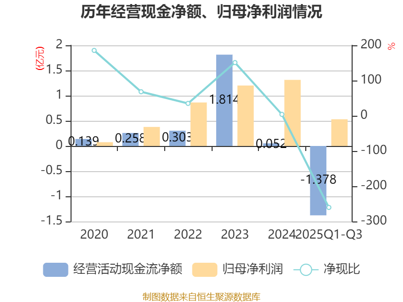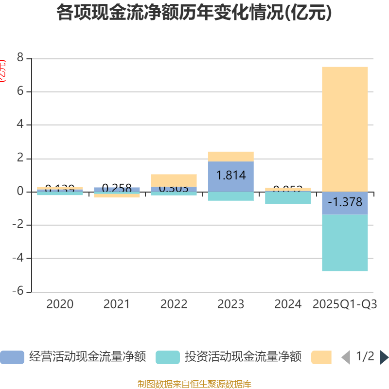 2025年前三季度,公司经营活动现金流净额为-1.38亿元,同比减少1.58亿元;筹资活动现金流净额7.48亿元,同比增加6.68亿元;投资活动现金流净额-3.38亿元,上年同期为-6519.8万元。