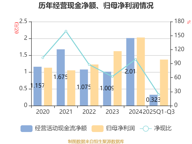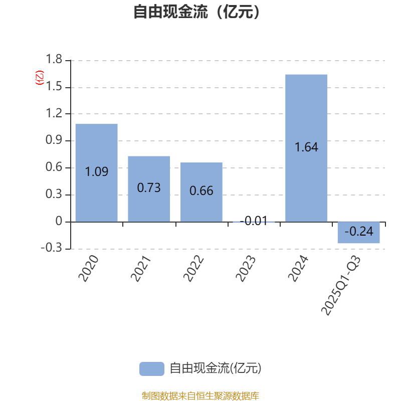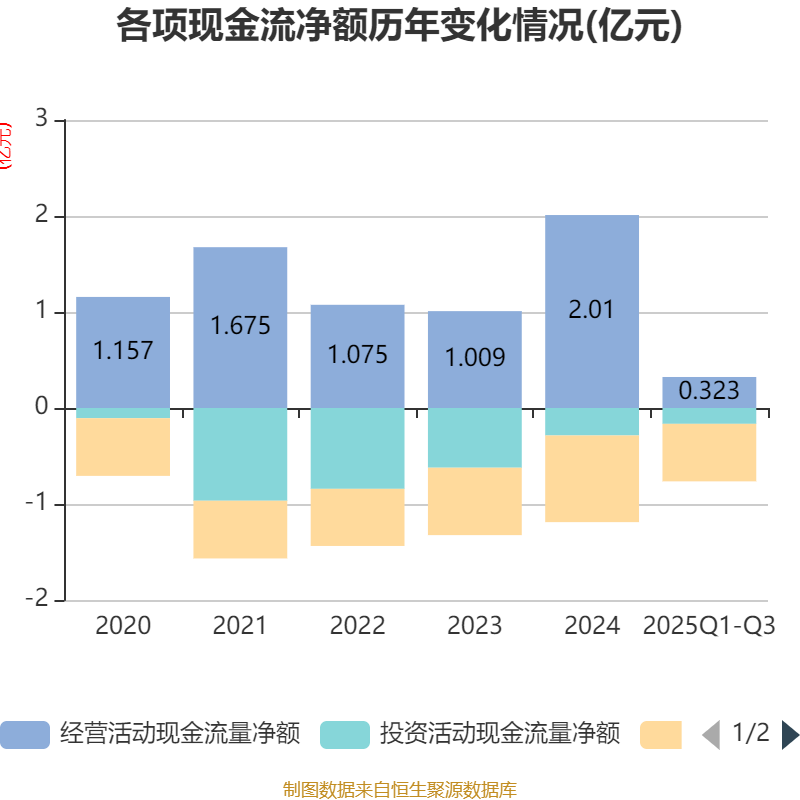 2025年前三季度,公司经营活动现金流净额为3226.1万元,同比下降76.85%;筹资活动现金流净额-5992.46万元,同比增加2.99万元;投资活动现金流净额-1651.36万元,上年同期为-2191.15万元。